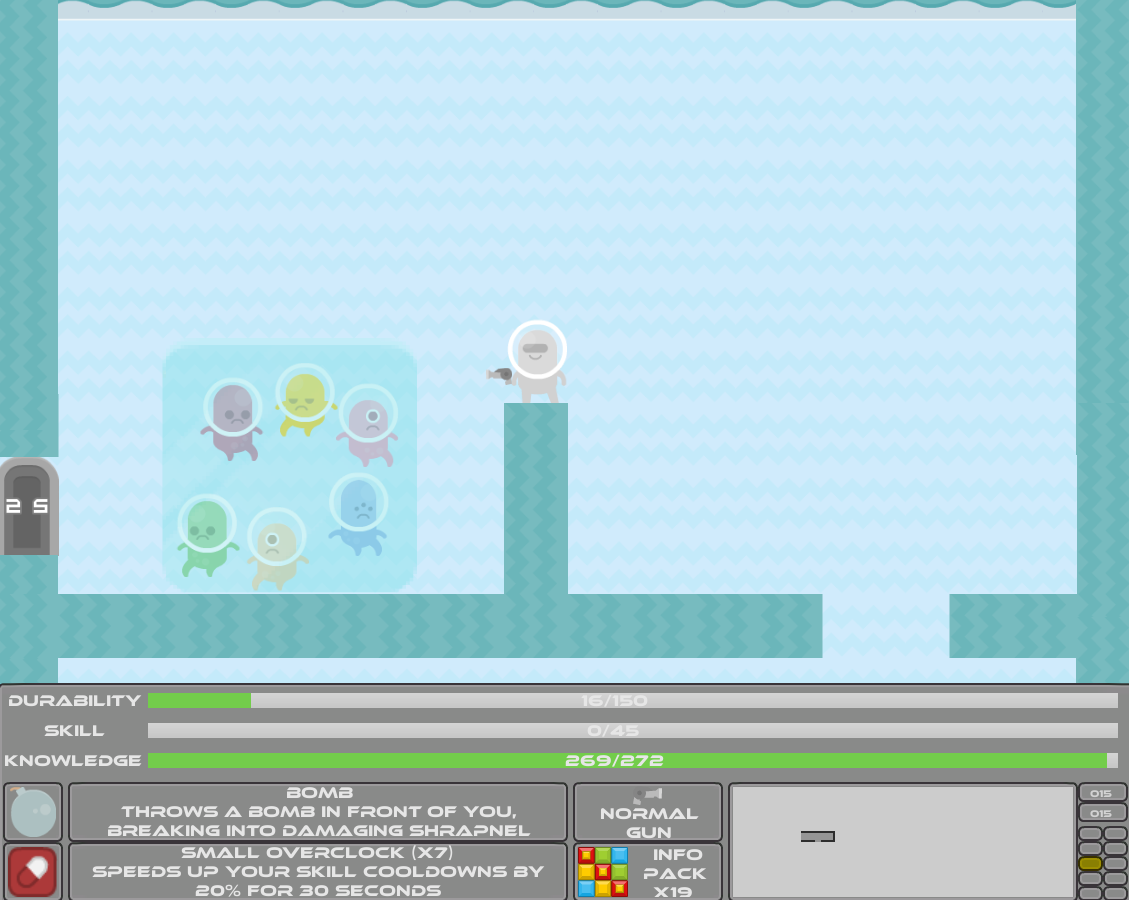 After defeating the second boss, the world shifts into ice-world. At least the player doesn't have to worry about flames anymore. The features of the ice world are many. Enemies are surrounded by mists of slowing ice and they are weak to fire weaponry. If the player picked up the optional flamethrower in state-2, now would be the best time to use it. Another feature of state-3 is ice that contain things - chests, characters, etc - that you can break away to reveal the contents. I just remember that I haven't coded the Energy Blade skill at all yet.