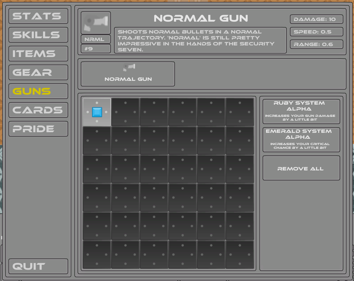 I've fixed two things about the UI today (and added some constants here and there instead of obscure int values to represent things, GEAR_BODY is way clearer than '3', although it takes more space to write). First, I've added an abbreviation of what each gear piece are, as they all have the same icon. It helps differentiating them a bit. Second, I've added a 'Remove All' button when you're customizing your gun. Whenever you break down to a lower state, your stats are taken down appropriately (Your maximum level is, after all, the minimum between your actual level, the number of infopacks you've collected, and the state * 10) so you might have gun parts stuck in customization slots that you can't use and there were no way to remove them, until now!