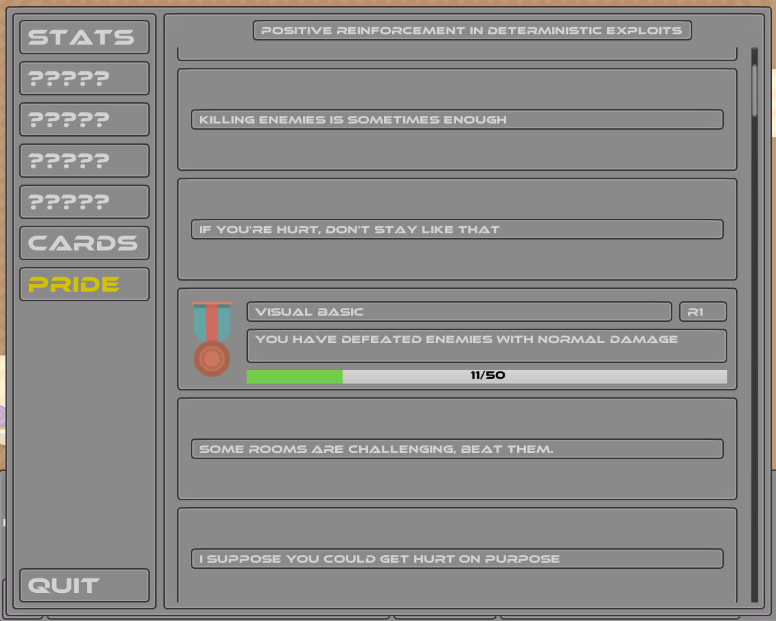 And now I have a quasi-functional achievement system, which you get by doing things. Achievements have gameplay implications in many different ways in my game, such as reinforcing some gear and unlocking secrets. In that way I think achievements are fine. The cards will act in a similar way, putting secrets to light while also giving the player a reason to do things.