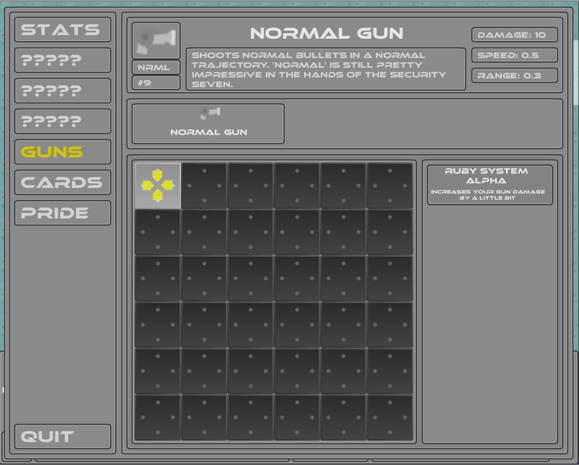 Didn't have much time to work on my game this weekend, but the gun system is more or less completed. You can now switch guns and socket systems into your gun using a grid. The higher your Energy stat is, the bigger the grid is. I've also made a few maps and laid the foundations for new mechanics, tomorrow I'm going to expand on them.