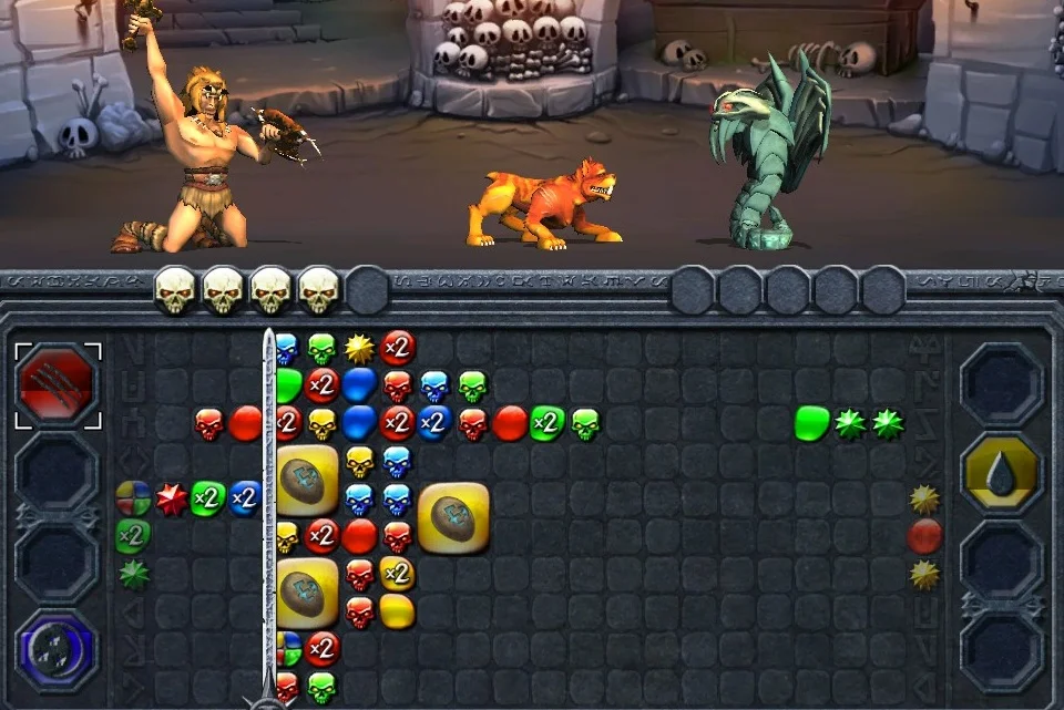 The main battle system is a mess. Basically, you need to match skulls with star gems so they break and that gives you rage, which in turns attack your enemy and that gives you more of the board to play with. You also match wildcards to any colors of gems and match regular gems with multipliers to gain energy to use skills. If you have items equipped and match a square of the item's color, you'll activate its power. Gems fall from left to right and you can rotate them and make them fall faster if you want.