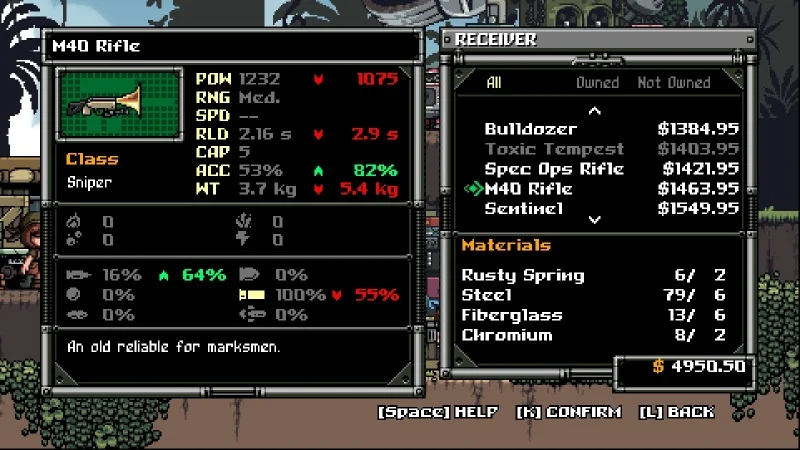 Customizing your stock, barrel, scope, magazine, receiver and ammo type, you can craft the gun you want. If you have enough percentage of a certain gun type - shotguns, piercing guns, magnums - your gun can fire bullets of that type. Everything is about trade-offs, you won't get an automatic shotgun and the more ammo you can carry, the less damage you deal. Money isn't a big issue but materials throttle the speed at which you can craft your gear.