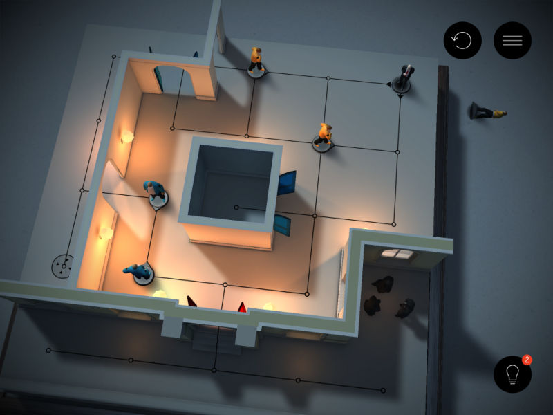 The mechanics are introduced slowly without any kind of tutorial, you’ll start a new level and there will be a thing you’ll need to use in order to win, and that’ll teach you all about that thing. Either rocks that you throw to make noise and move guards, trapdoors to move around the board, costumes to disguises yourself as a specific guard color and keys to open doors, everything is explained by the way you use it. The game then throws special challenges like finishing the level in X turns or less, not having any kills or picking up a suitcase that might be out of your way. If you’re stuck on any of these, you have a few hints you can spend for the game to show you how it’s done. Some of these make me wonder if there’s a way to finish the level in even less turn, or if they were designed with that minimum built-in. Sometimes the tricks aren’t as obvious either, moving back and forth to set up favorable patterns can be quite obscure