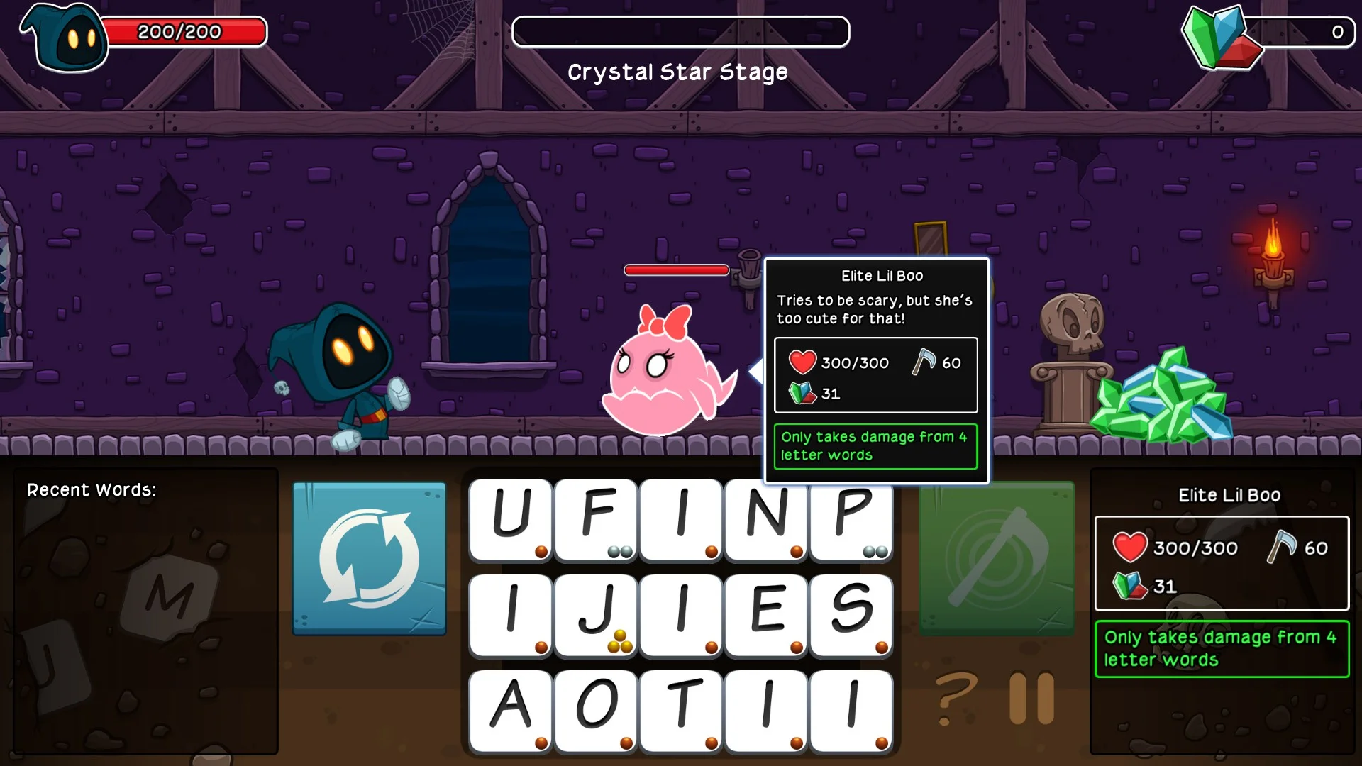 There's a good bit of randomness involved in your victory or defeat, the letters are a good chunk of that randomness. Especially in challenges where you have a limited time to win, not being able to quickly make words can spell your death. Crystal tiles are also quite random; some of them have slightly helpful effects, like giving you 15% of your health back, but the diamond tiles will just give you every buff possible. I had to retry certain challenges a couple of times and that's in part because of the way this game works. It's rarely frustrating to lose because most of the time you know you haven't found enough words to win, but sometimes the randomness spoils the fun a little.