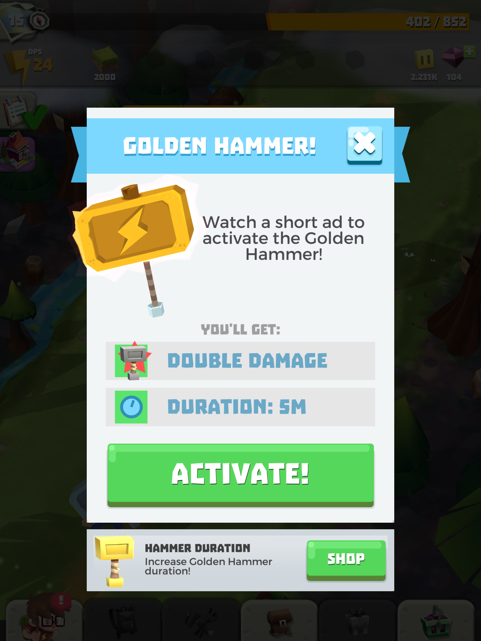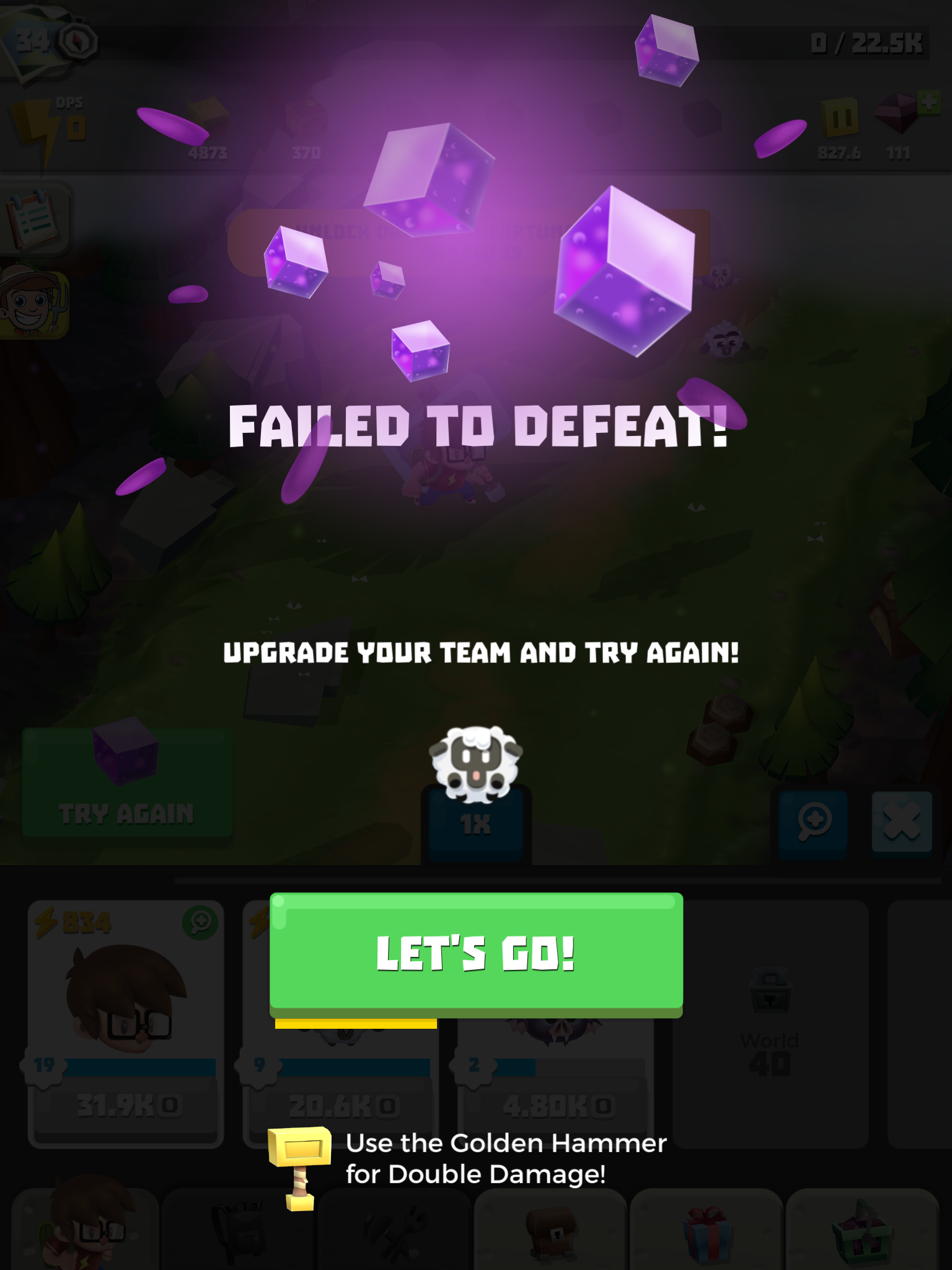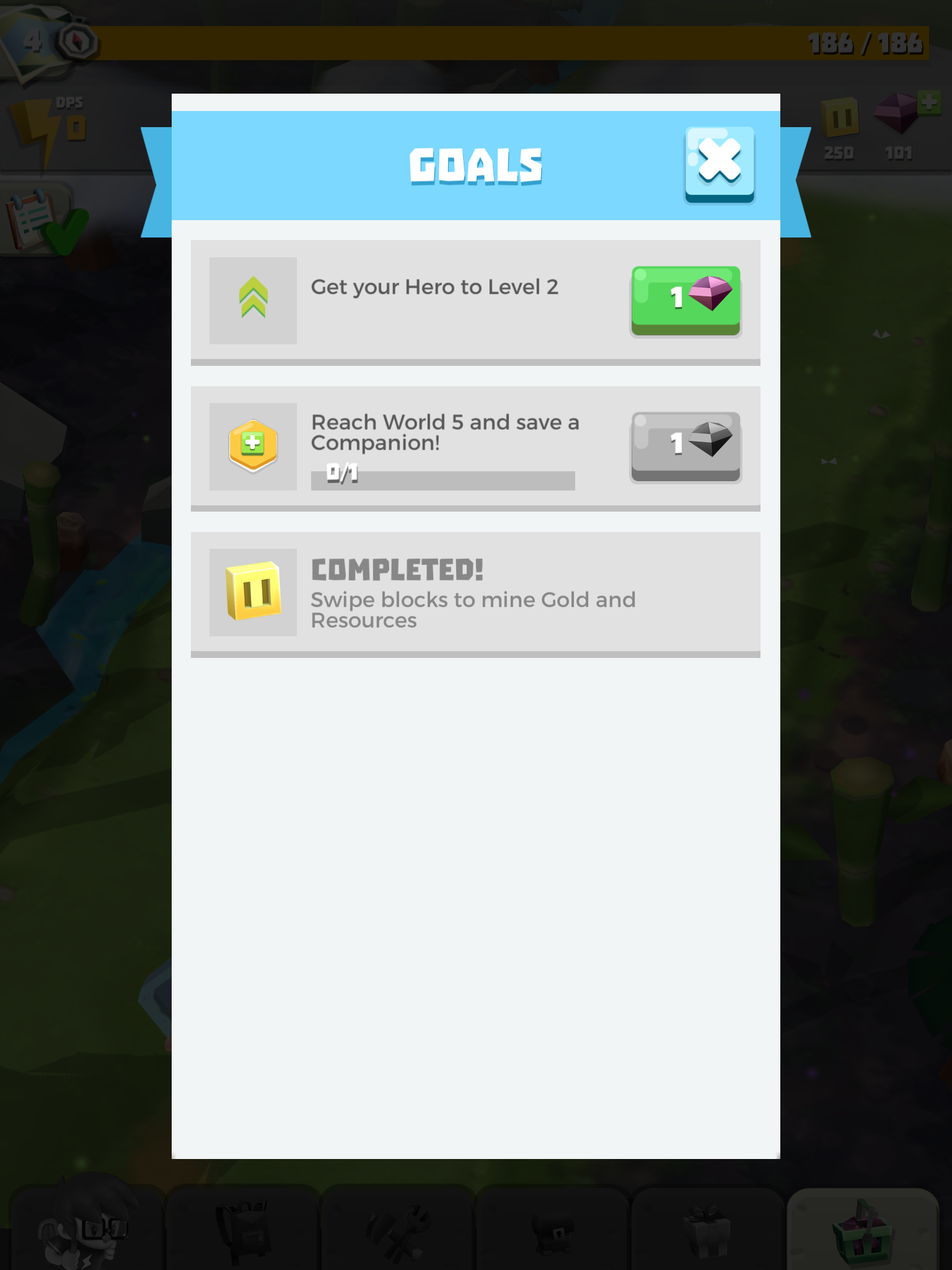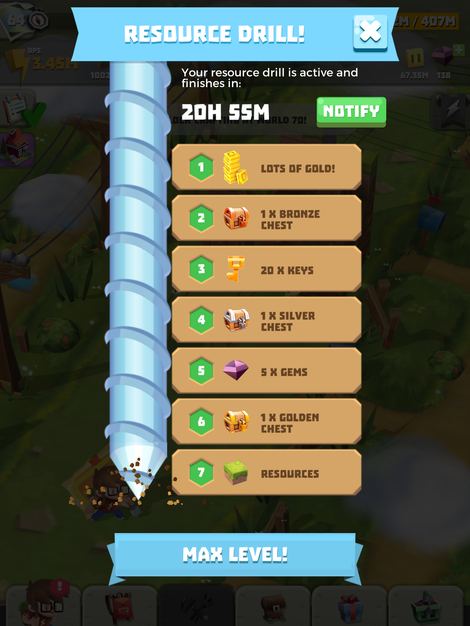 The game tries to keep things interesting with goals to complete and a bunch of systems to increase the power of your automatically-attacking friends, but it failed to grab me because of the poor core gameplay loop. Other systems are much more craven; The golden hammer doubles your damage, but it’s a premium item, there’s a ‘jackpot’ minigame where you select random rewards and lose everything if you pick the wrong one and there’s the dreaded ‘resource drill’ that gives you a bunch of rewards but requires you to watch SEVEN ads in a row in order to get everything. All of these things, combined with locked chests and other systems on timers (that you can skip by spending currency) make the whole affair rather sad.
