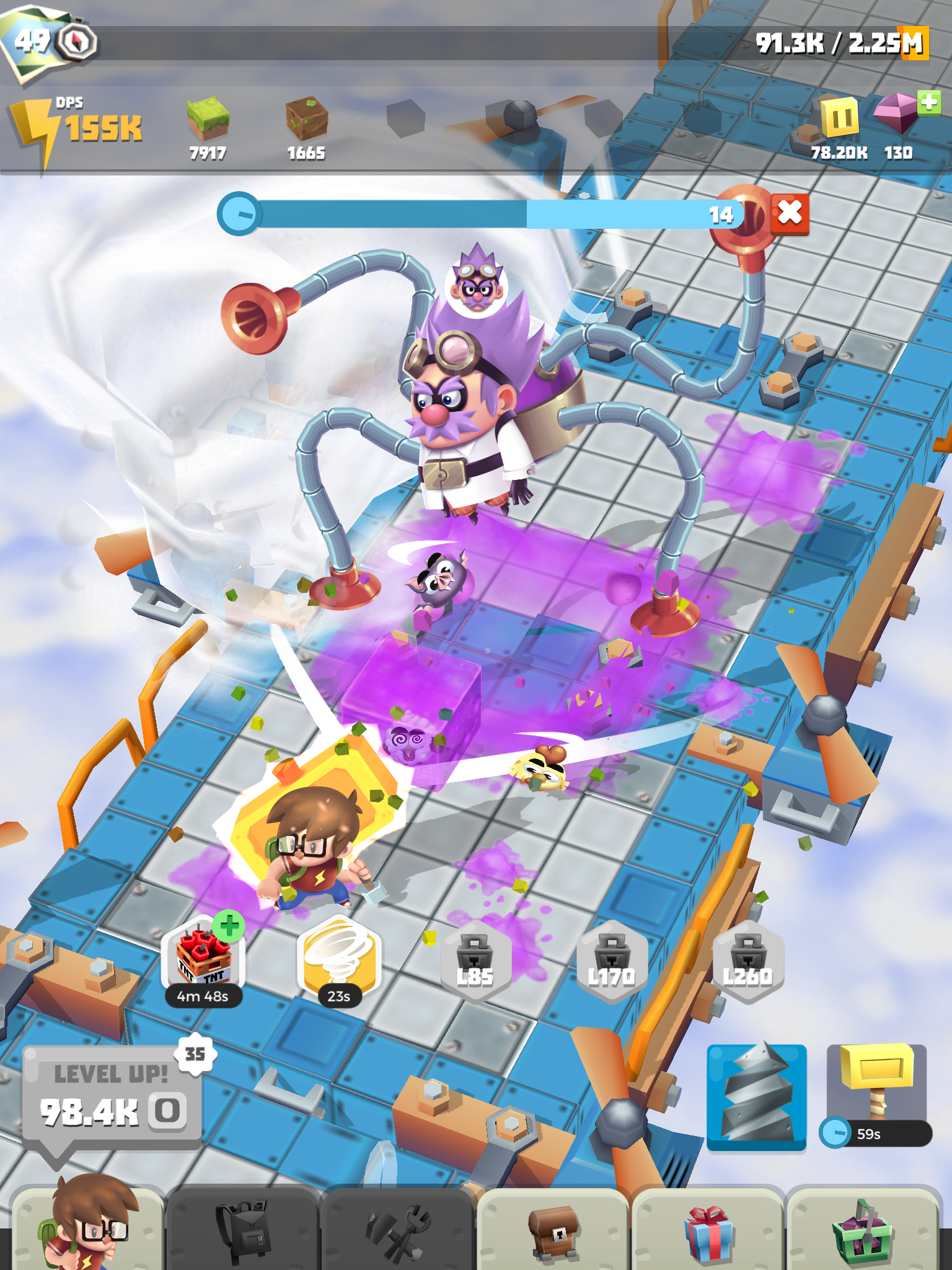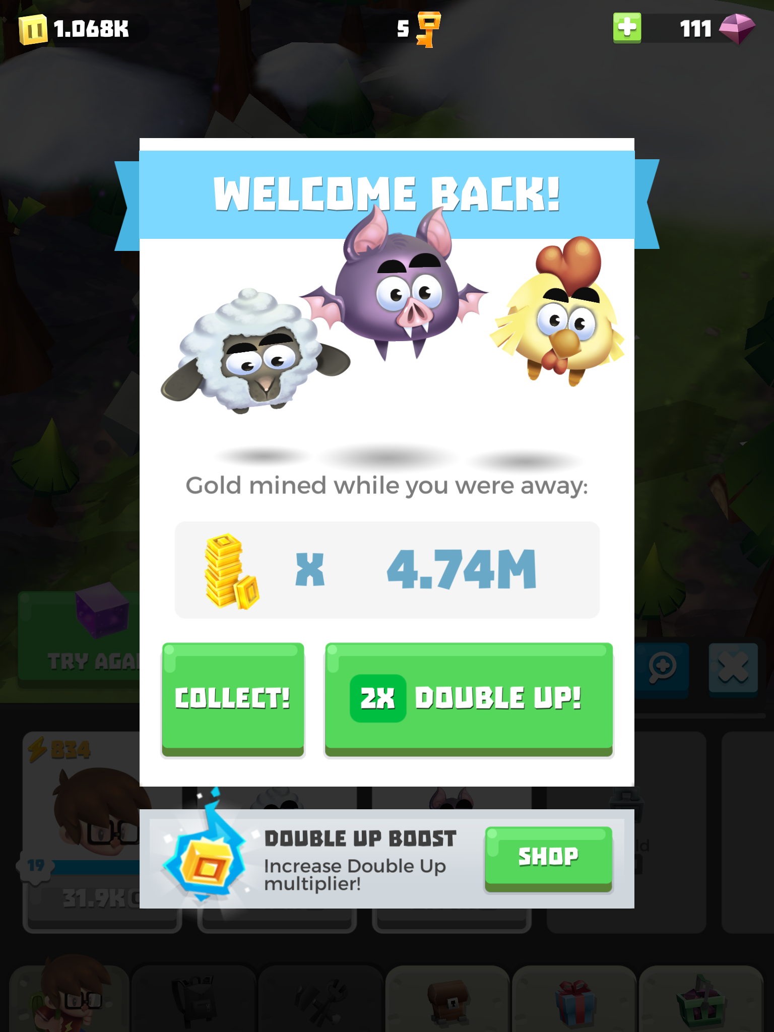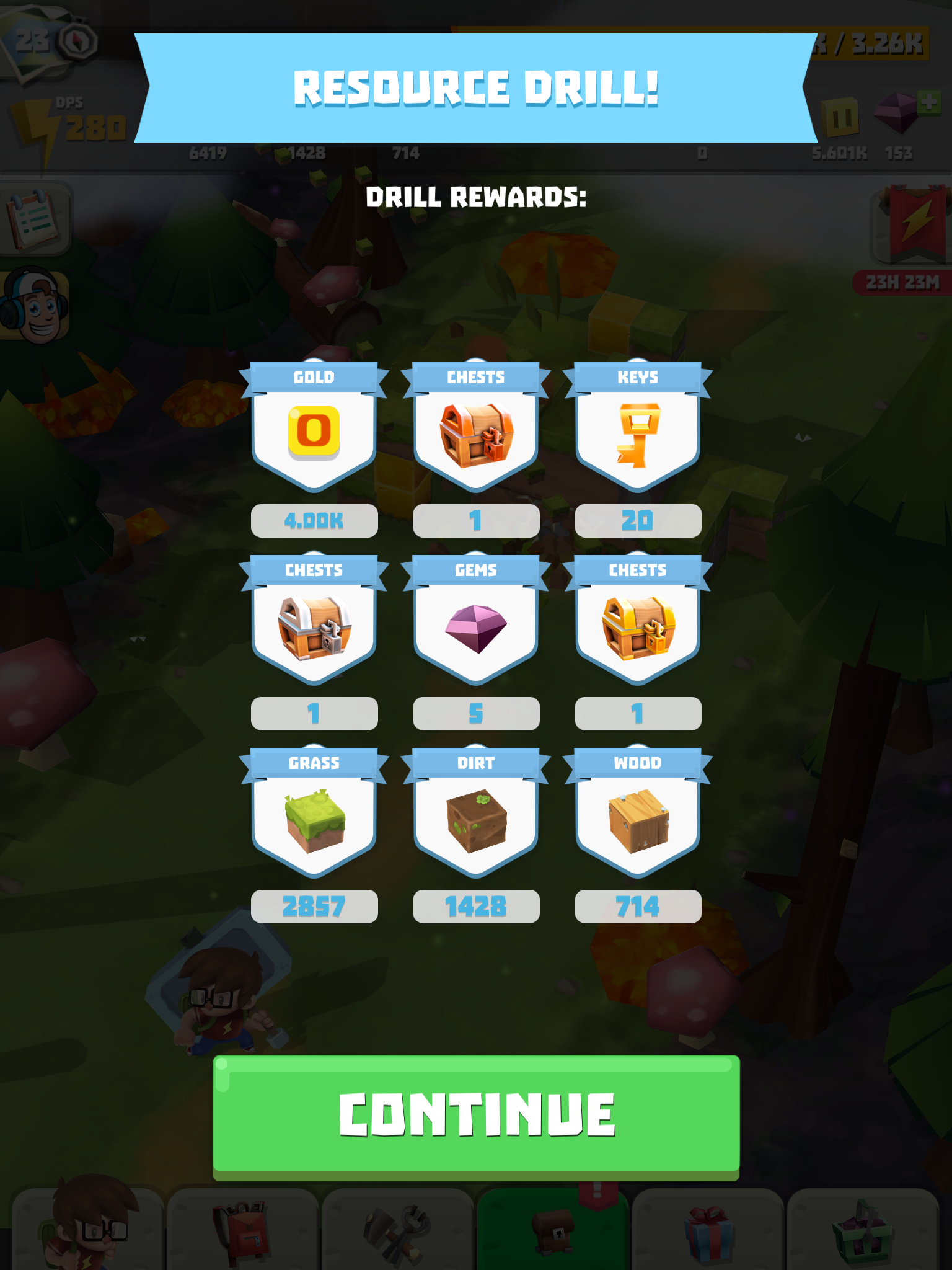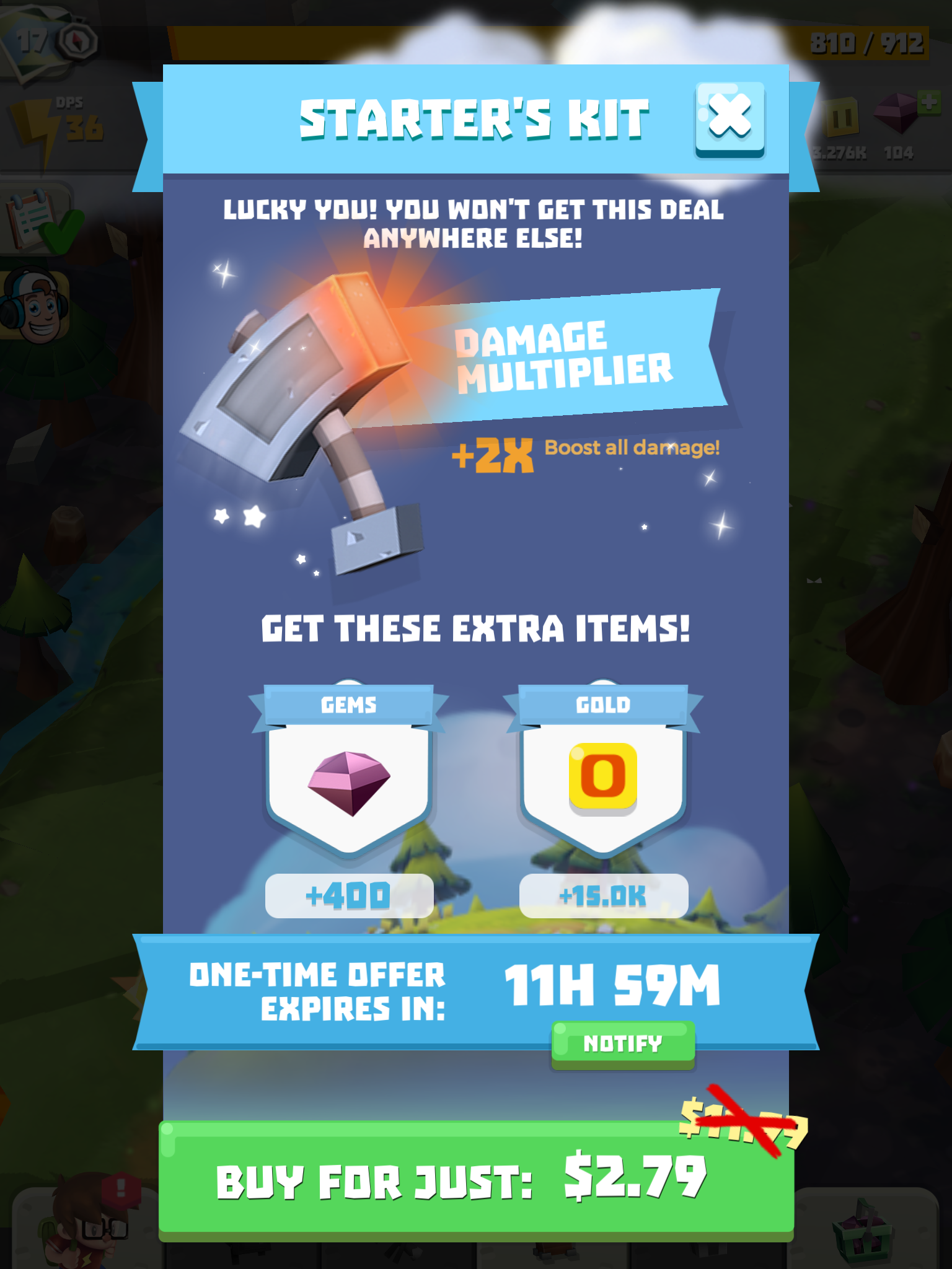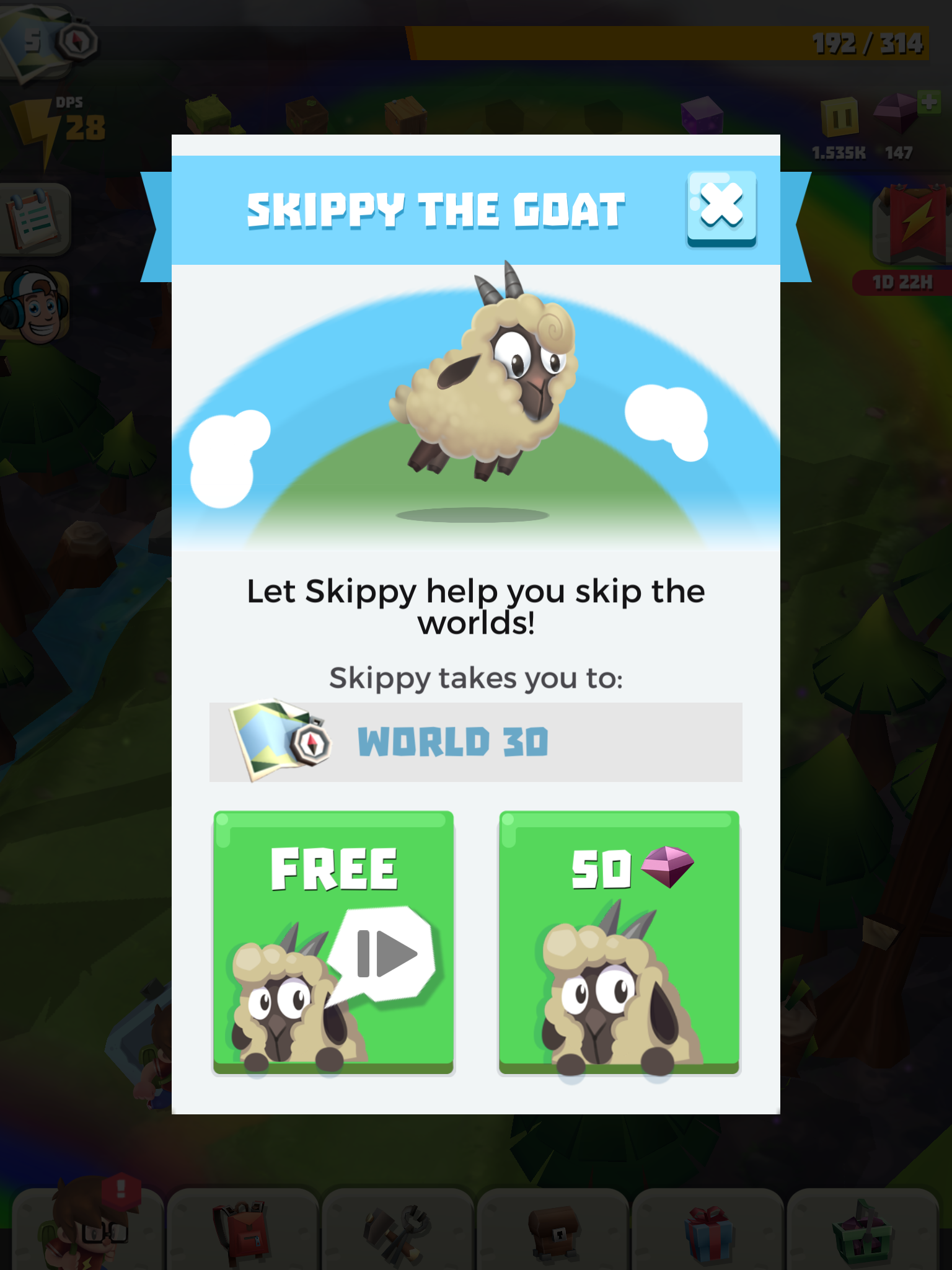 The game tries to keep things interesting with goals to complete and a bunch of systems to increase the power of your automatically-attacking friends, but it failed to grab me because of the poor core gameplay loop. Other systems are much more craven; The golden hammer doubles your damage, but it’s a premium item, there’s a ‘jackpot’ minigame where you select random rewards and lose everything if you pick the wrong one and there’s the dreaded ‘resource drill’ that gives you a bunch of rewards but requires you to watch SEVEN ads in a row in order to get everything. All of these things, combined with locked chests and other systems on timers (that you can skip by spending currency) make the whole affair rather sad.