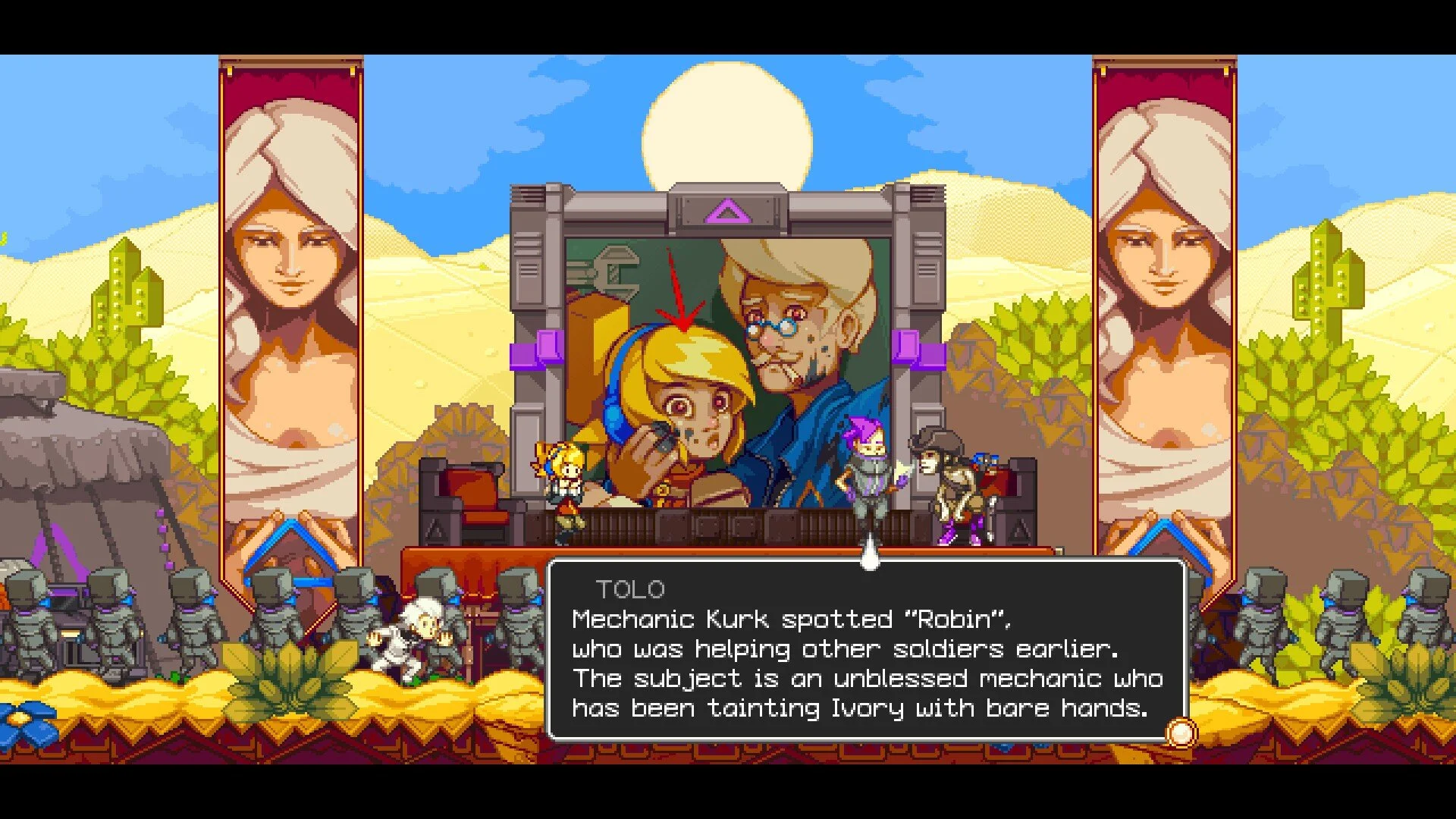 Most of the puzzles involve moving things around with explosives and getting blocks in specific places (or riding them) to get where you need or to unlock new passages. The theory of what you needed to do was simple enough in most places, but the execution could get finicky with the explosives being physics-based and rolling around and not always getting where you needed them to go. Besides a few puzzles which were really annoying, most were fine, however. Iconoclasts also likes its minigames, which gives the world personality and charm and even if I had to restart some a few times - either because I didn’t understand them at first or just plainly failed - the game does not punish you, so you can retry pretty quickly.
