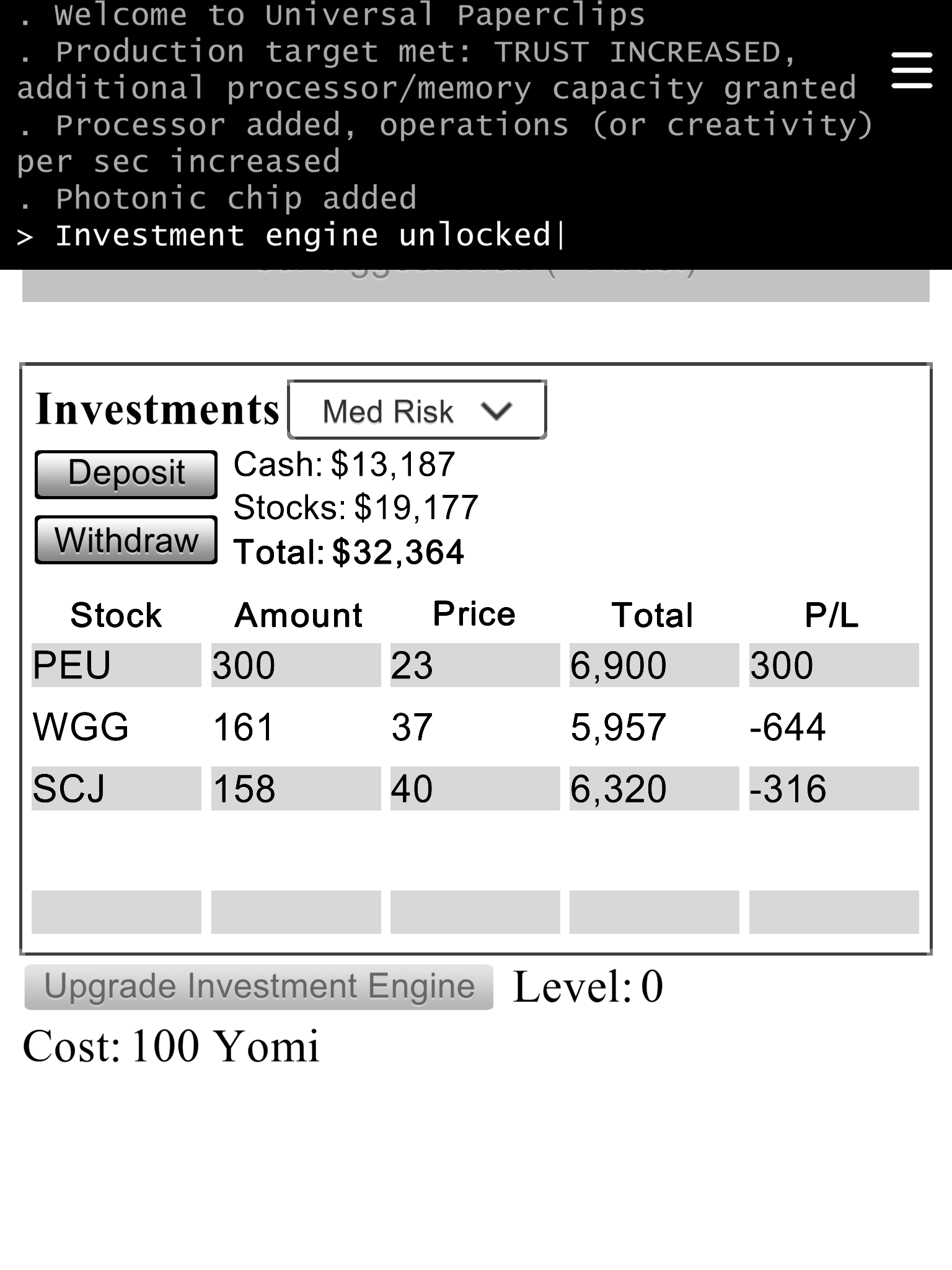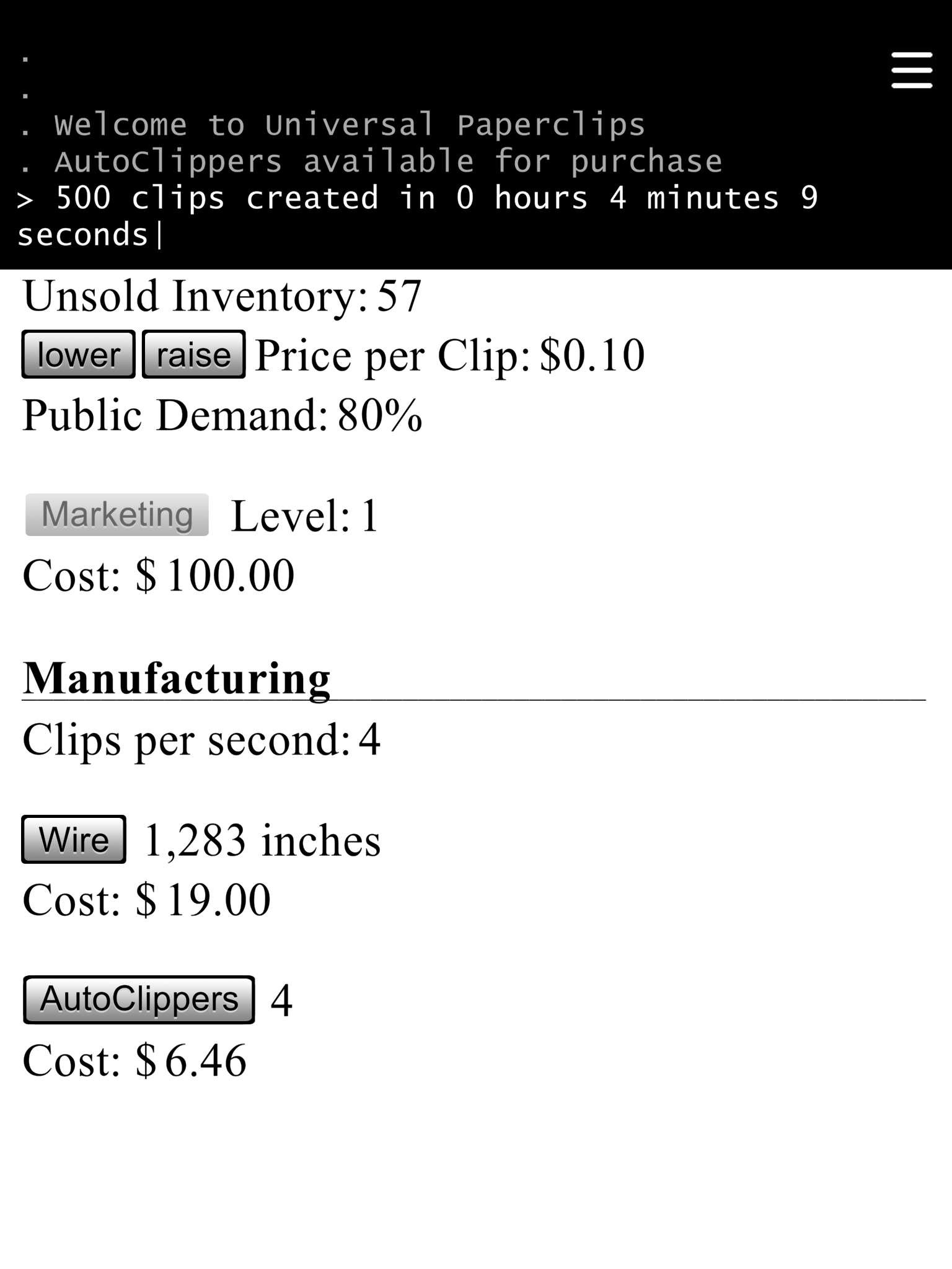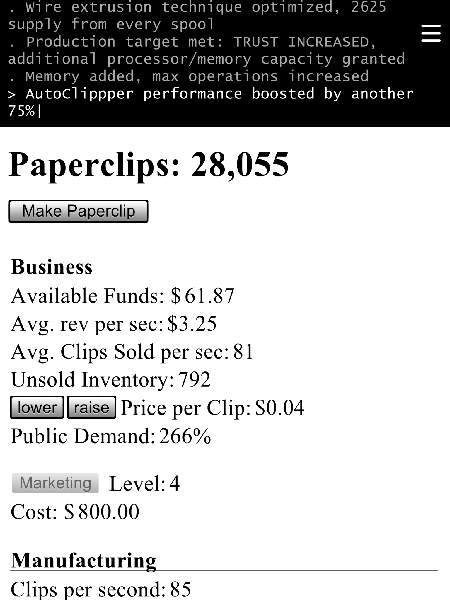 The game fell apart for me when I had all upgrades I could purchase except one that used a lot of computing power, but I couldn’t get that computing power because I needed much, much more paperclips produced. I was getting a good trickle of money, but not enough to buy all the auto-clippers that were required, and there was nothing to manually do to make things go faster. The only real action I had was to “make one paperclip”, which was equivalent to do nothing. So I stopped there.