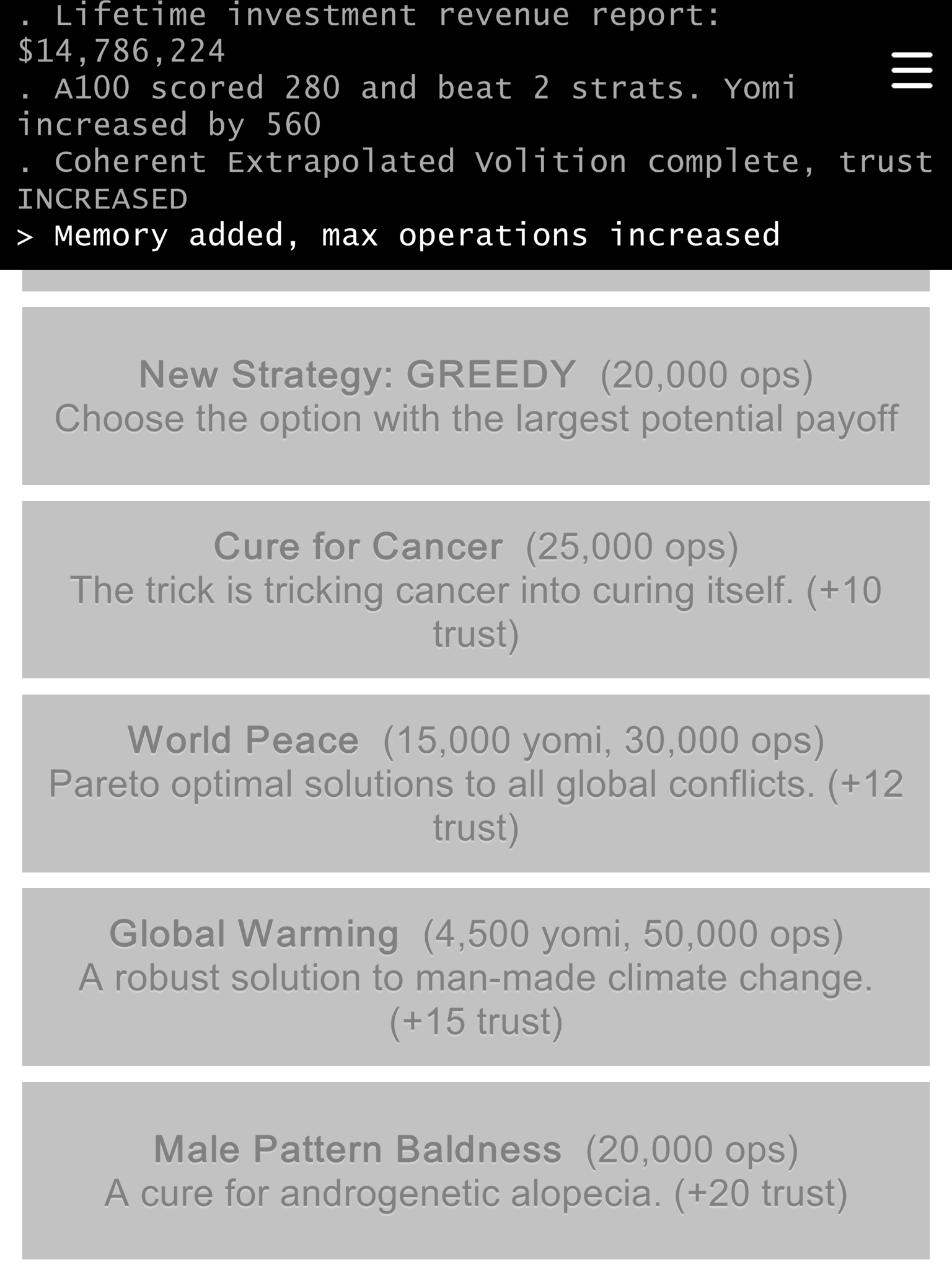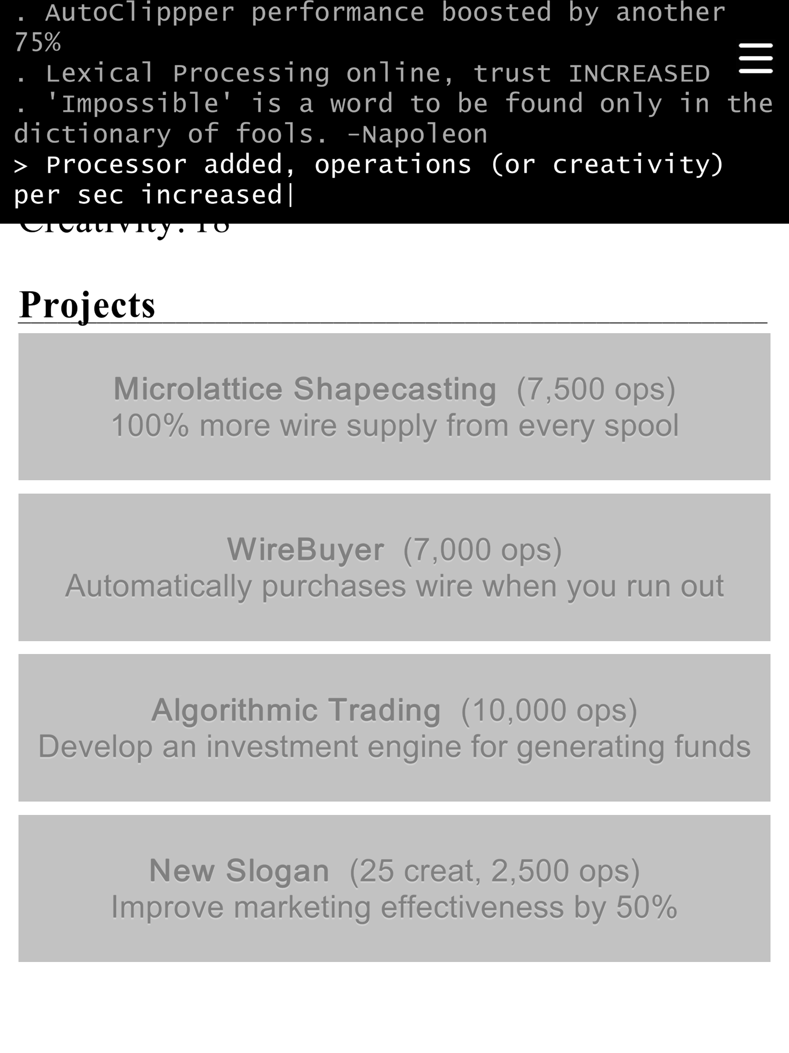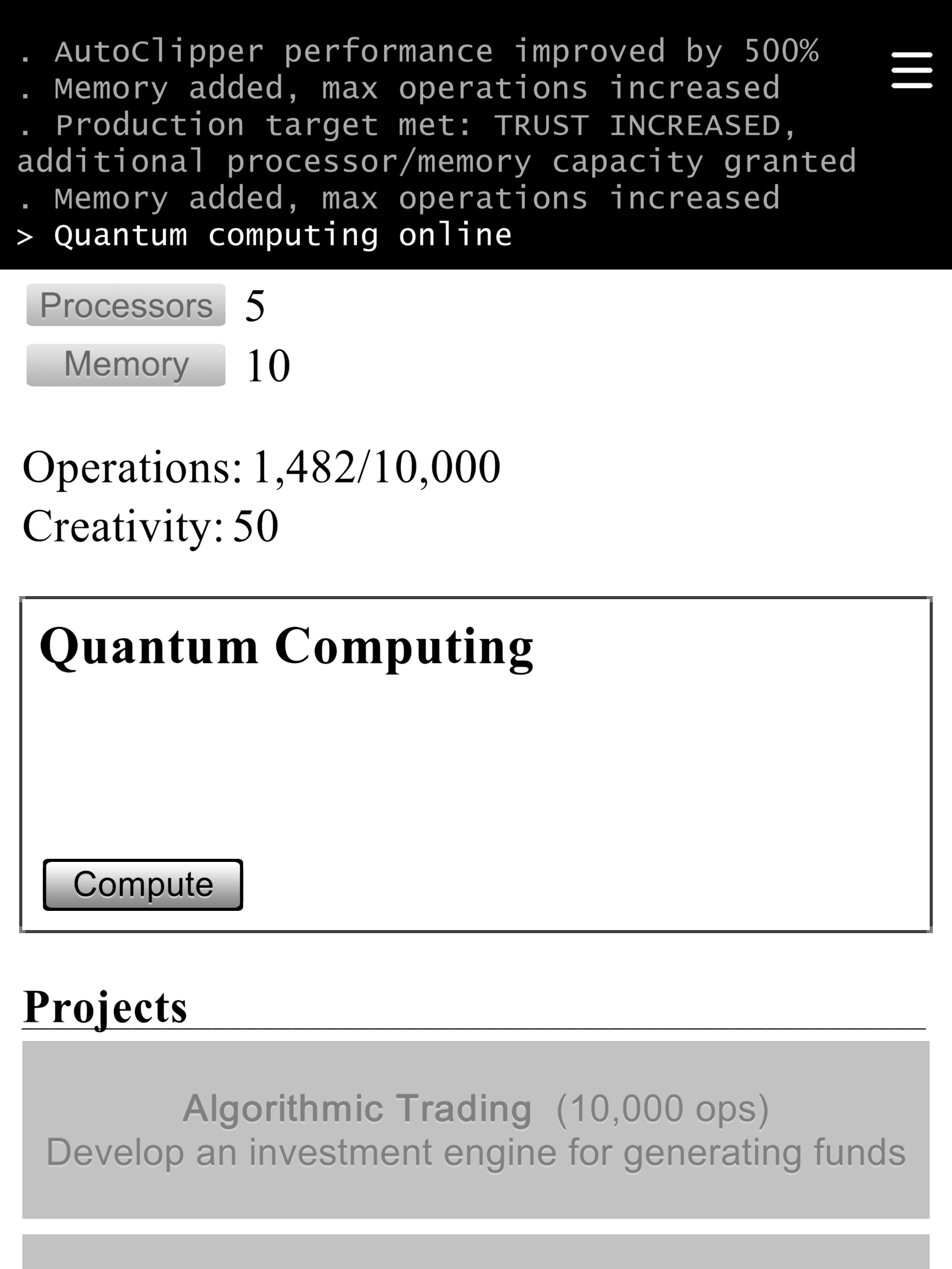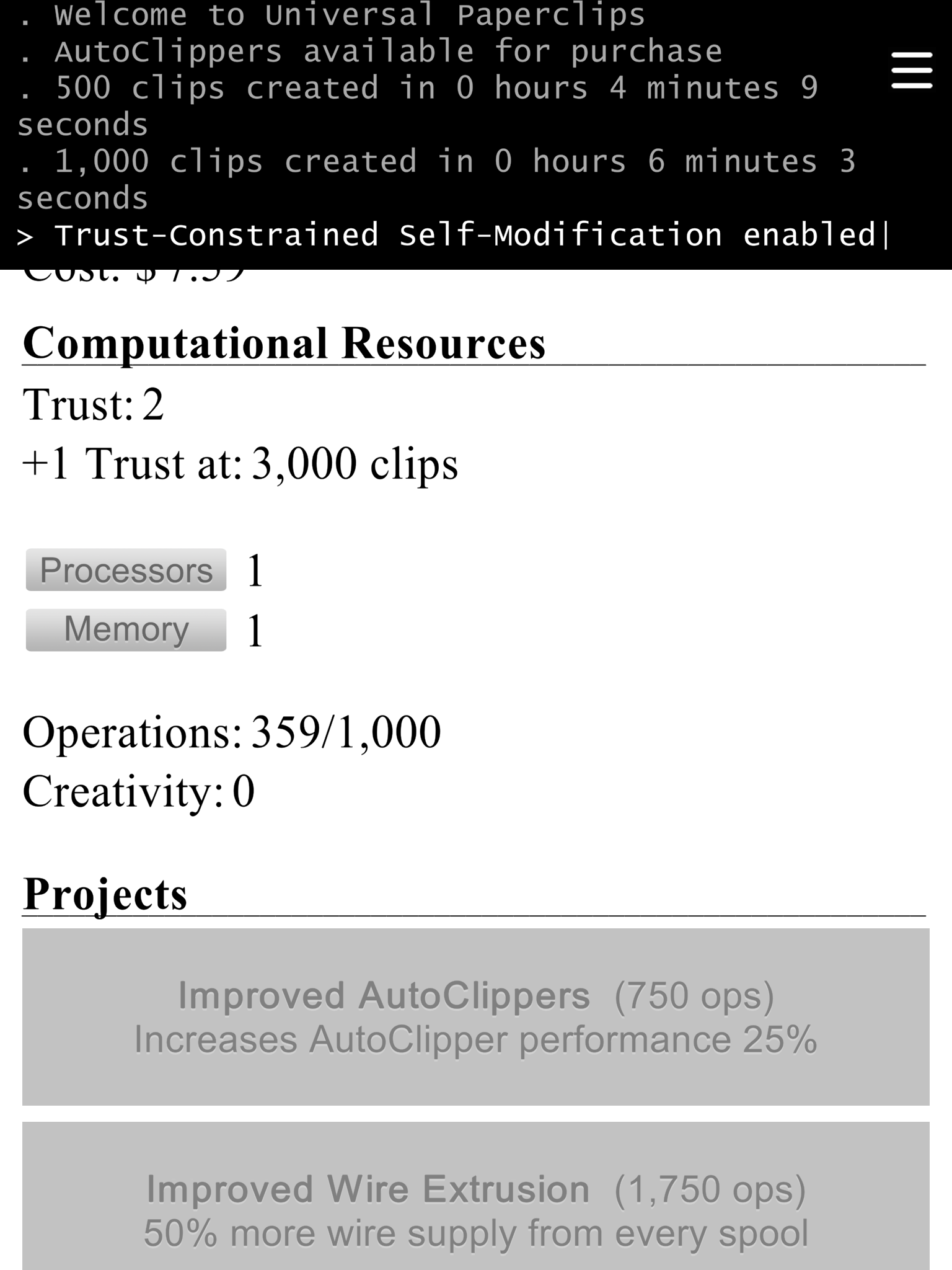The game fell apart for me when I had all upgrades I could purchase except one that used a lot of computing power, but I couldn’t get that computing power because I needed much, much more paperclips produced. I was getting a good trickle of money, but not enough to buy all the auto-clippers that were required, and there was nothing to manually do to make things go faster. The only real action I had was to “make one paperclip”, which was equivalent to do nothing. So I stopped there.
