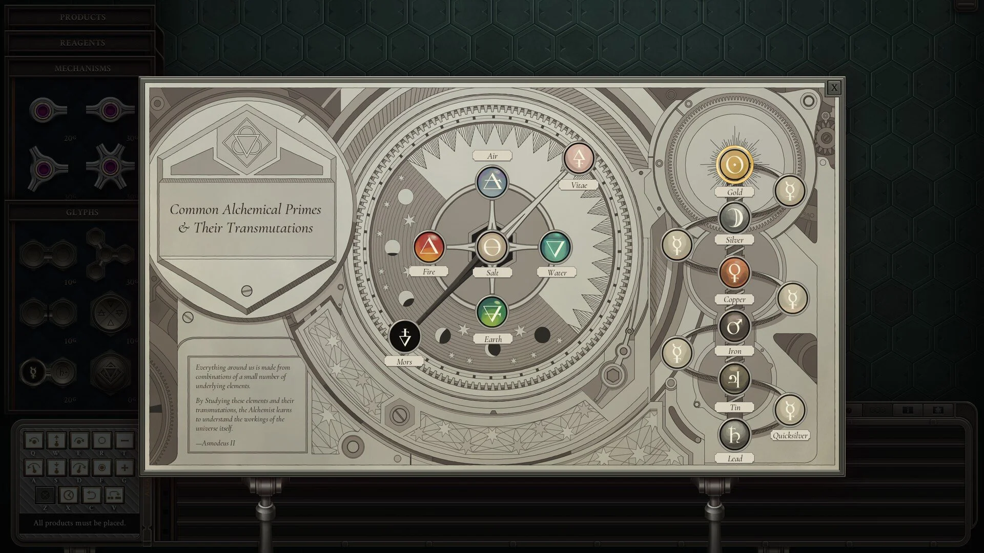 The complexity also comes from the glyphs you need to use to solve certain problems. The most basic ones link two atoms together (or unlinks them) but in order to create metals, for instance, you need a special glyph that consumes quicksilver to promote metal to a higher tier. Sometimes you’ll need to triple-link things together. Sometimes you have to turn your elements into salt, sometimes you don’t have elements and need to use a special wheel to create one. This is more or less always supported by the story, which is engaging enough to feel welcome here. There’s also a small mini-game about clearing marbles on a board, which is neat.