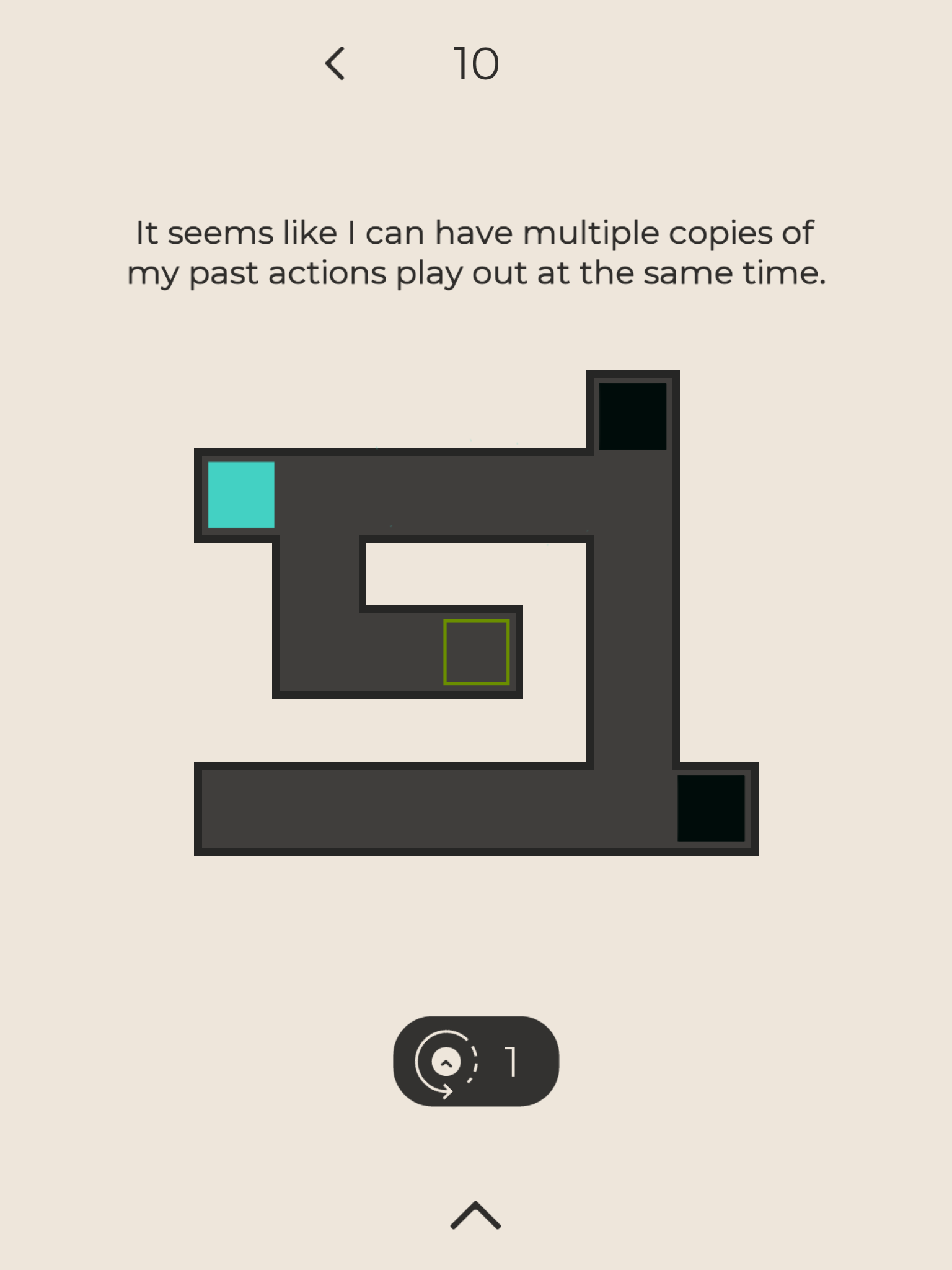 I have not much to say about the diverse mechanics that The Chronos Principle deploys as you go along; They are neat ideas and make the levels increasingly complex and become tests or your timing and thinking ahead. What I have issue with is the timing aspect of the game. When you move your square around and plan for the following “tries” in order to use your already existing squares - either as stoppers or to open paths - the game records your actions in real time and then plays them back to you. This means that if you start a level and think about your next moves for a long period of time, you’ll probably need to restart because when you playback that run, the old square will also wait for that long period of time. This becomes annoying in spots and the lack of precision - you don’t have a good way to tell when things are going to happen on a timeline - has you counting beats in your head and timing actions mentally, which isn’t that obvious. Maybe the game would’ve worked as well on a “turn”-based system where actions are played in sequence, move by move, instead of in real time - in this case, a ‘wait’ action would’ve been necessary.
