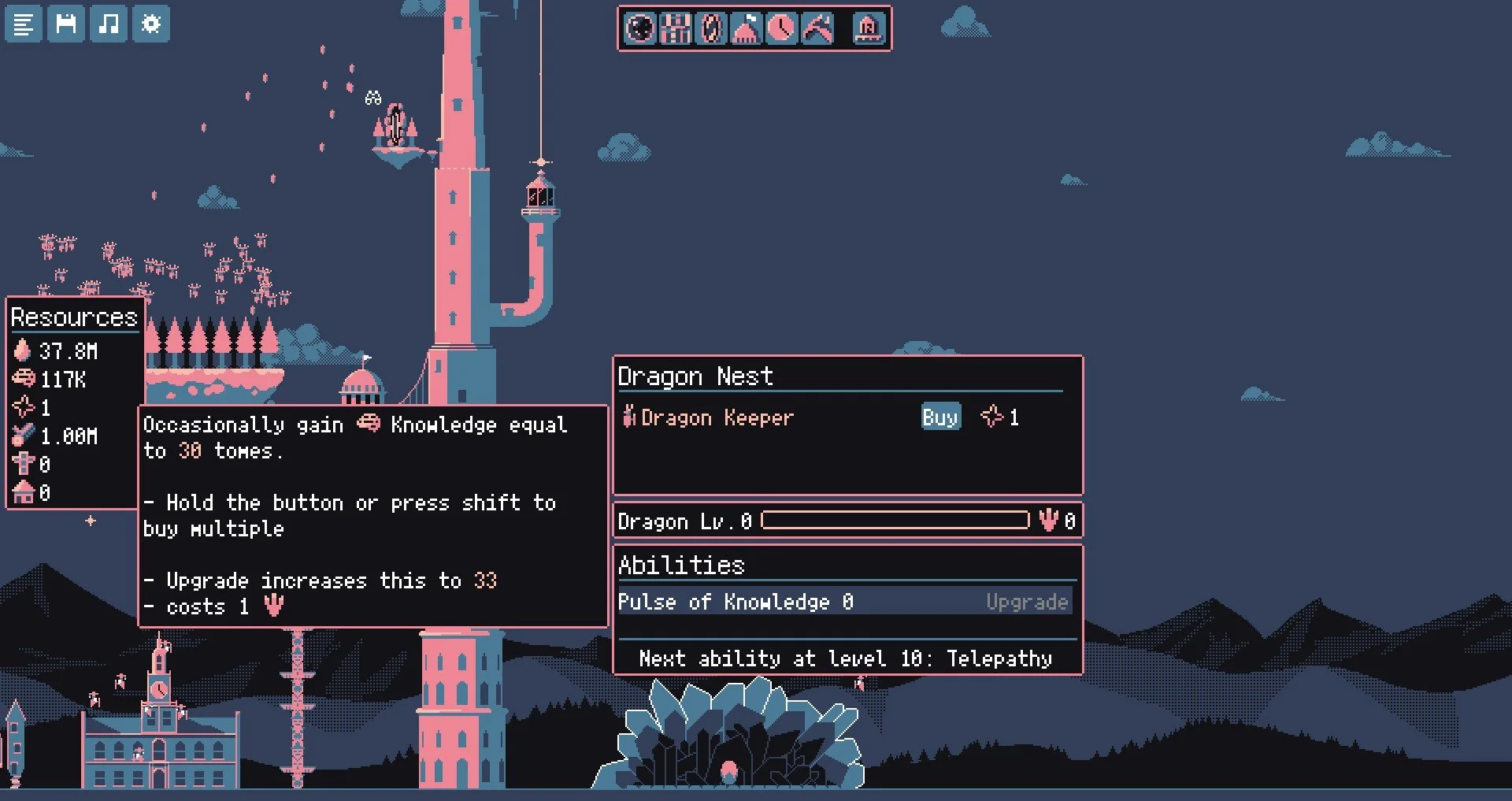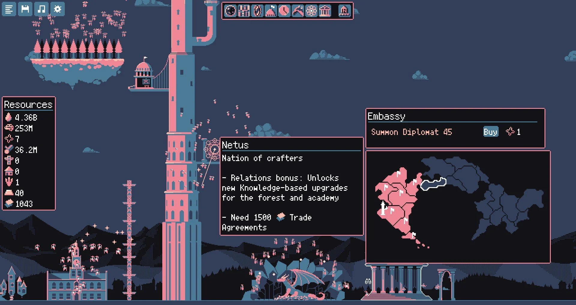 After that, you get to build various structures using knowledge from your Study, like an Academy where you research upgrades, a Dragon’s Nest where you raise a dragon (to unlock upgrades), an alchemy lab (where alchemists create gold that you use to create relics that boost your other systems), and an embassy (where Diplomats produce trade agreements that you spend on nations to give yourself upgrades (this system has an end when you have all the upgrades, which is kinda silly)).