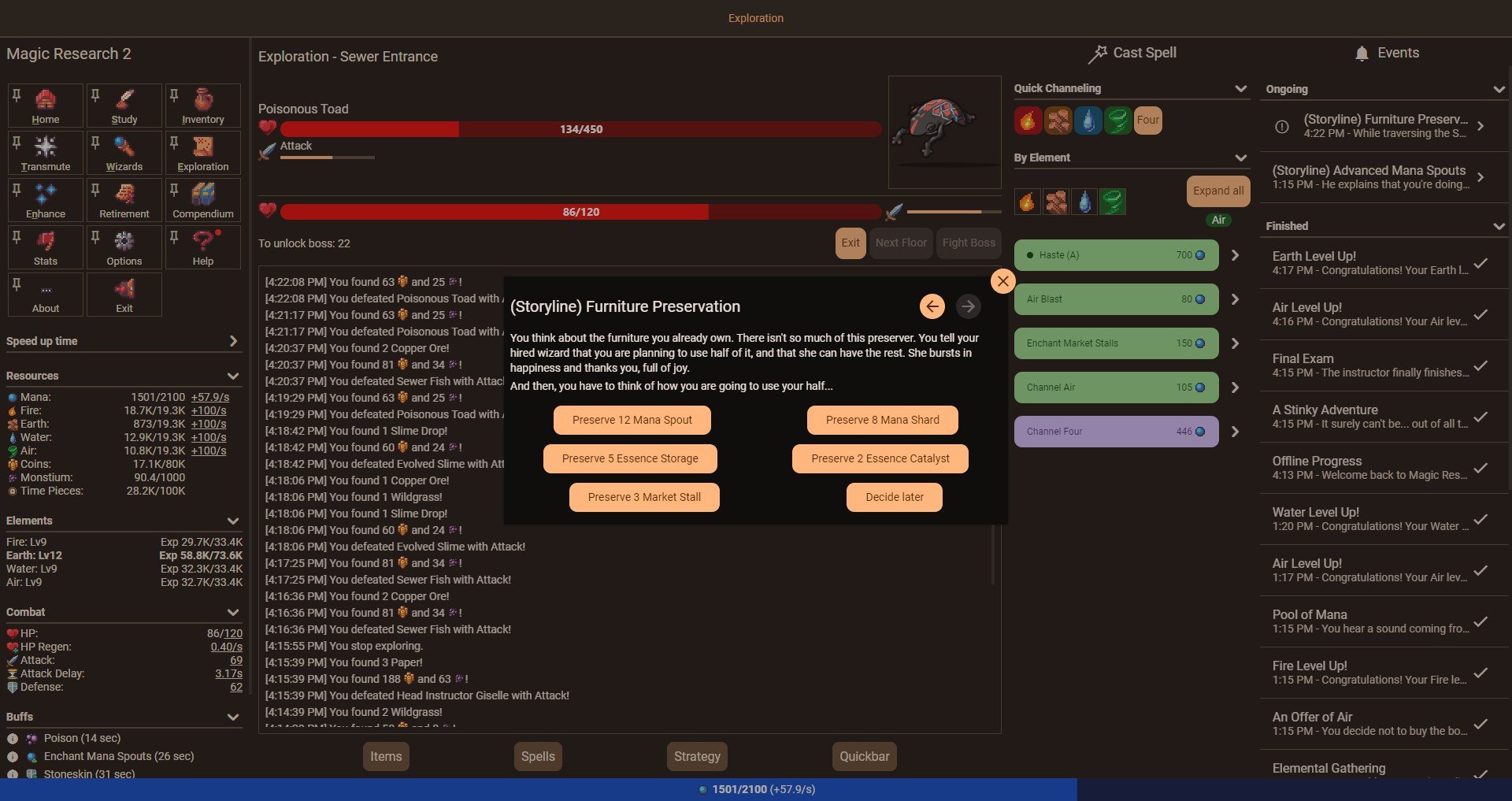 Starting a new game, the tutorial walks you through picking an element (fire, earth, wind, water), then you gather mana and channel elements in order to create resources that you spend to gather mana automatically and store more resources. This is the core of what I’ve played so far, you can buy upgrades and boosts, but at some point you’re at maximum capacity for one resource or another, so you have to progress in another way to get more stuff done. You get researchers that give you elemental experience, and then you unlock transmutation.