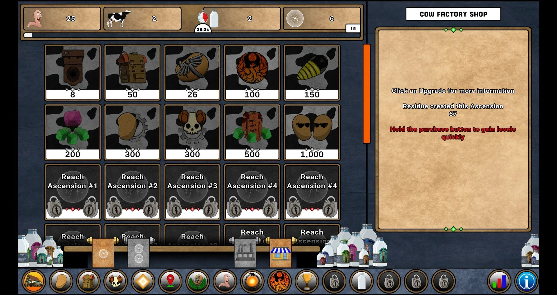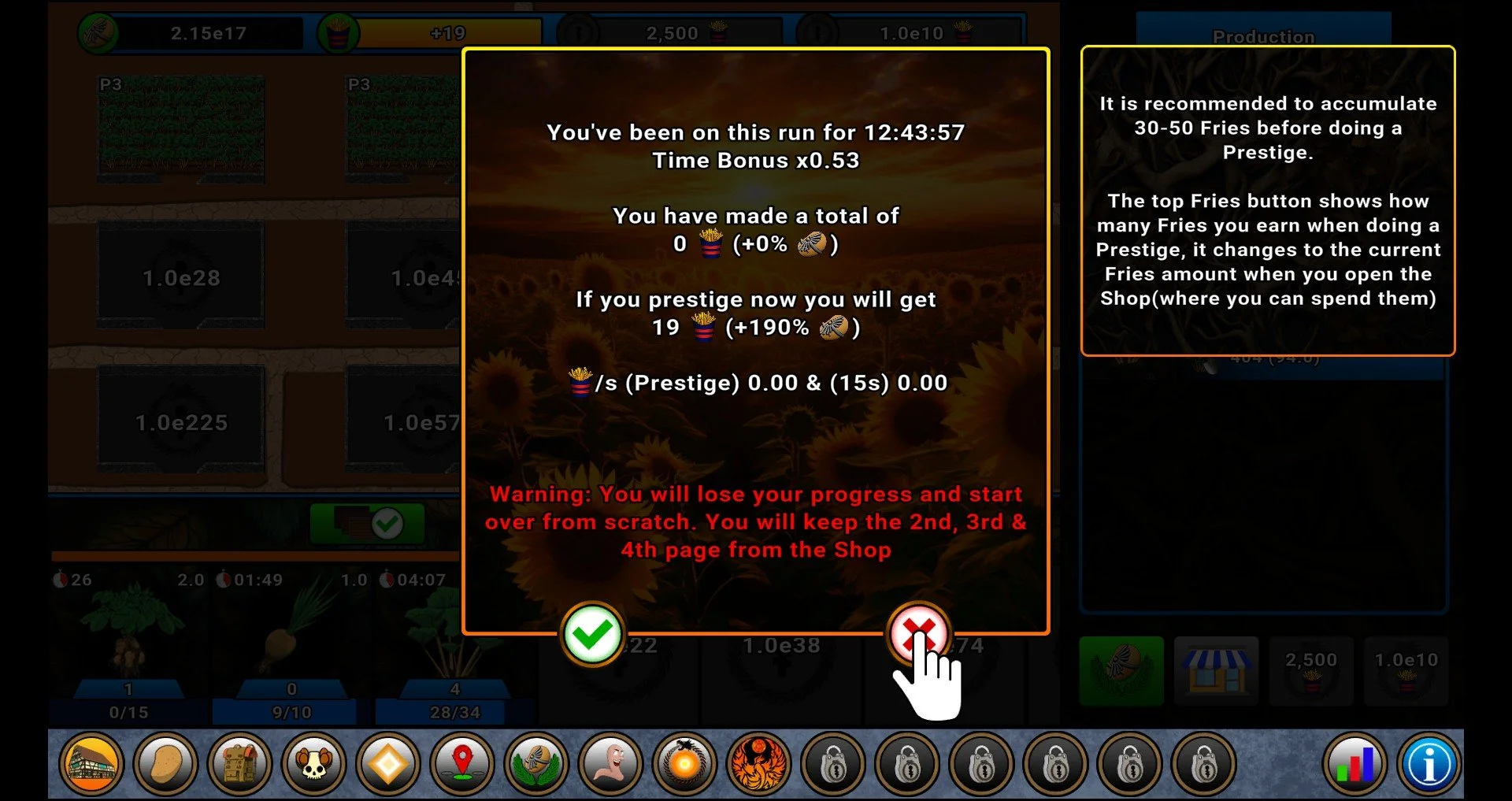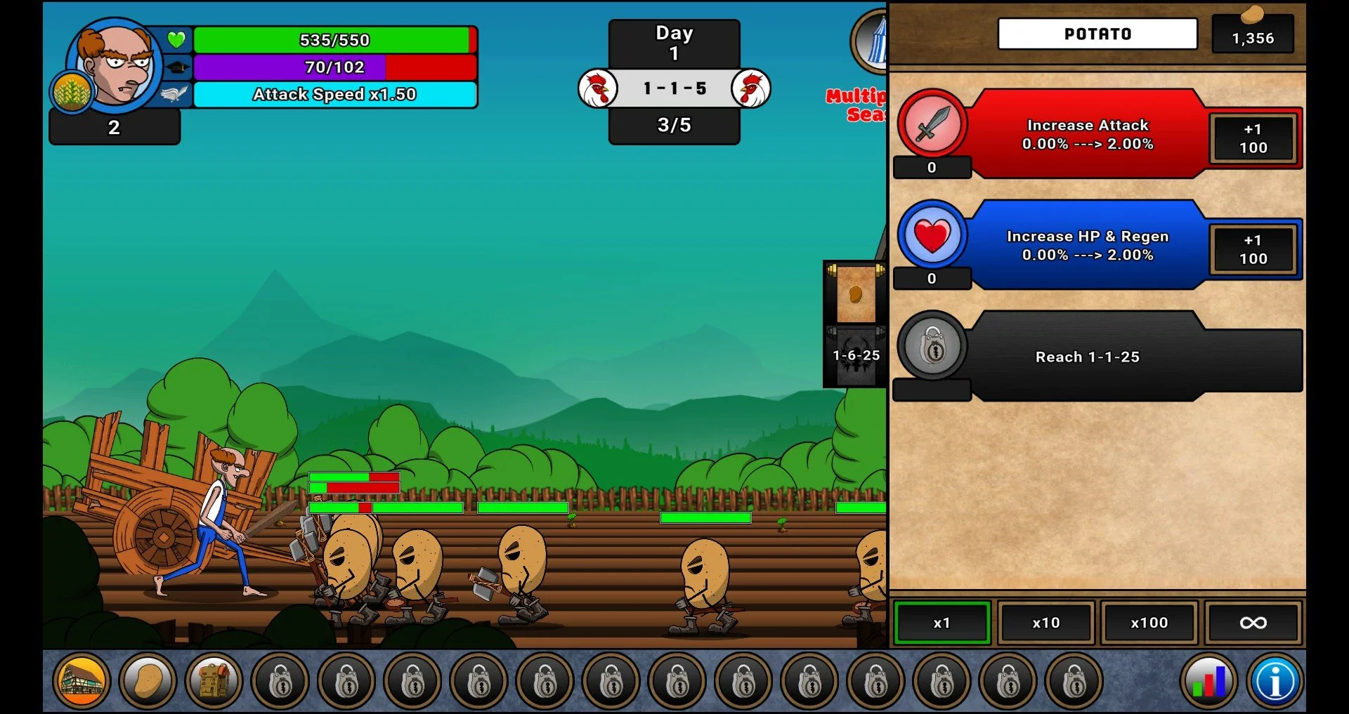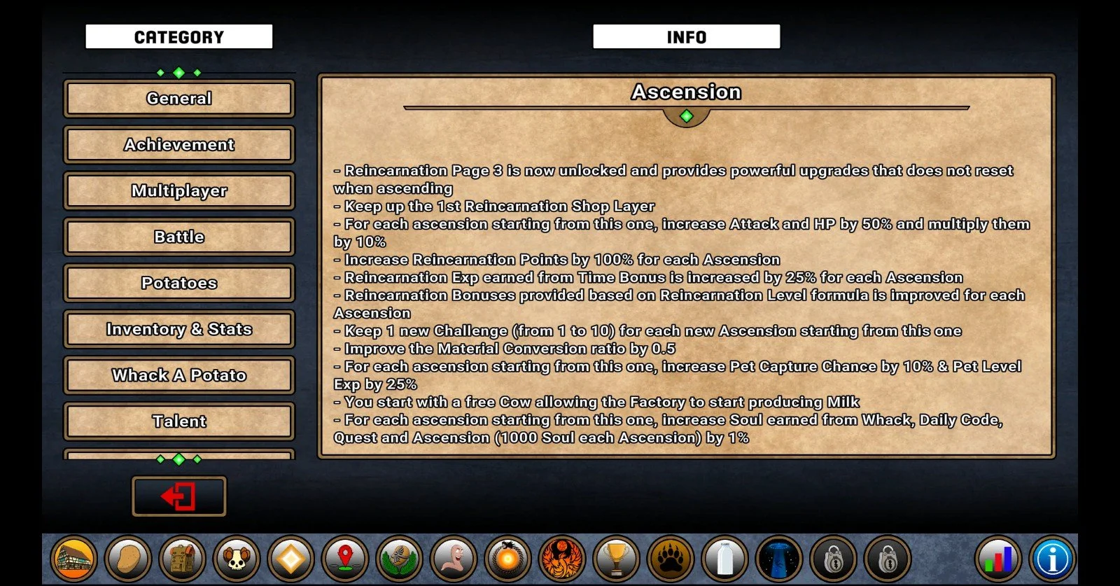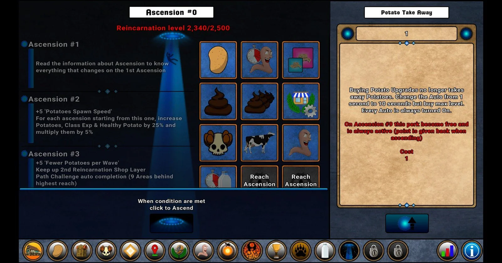 The game has multiple layers of progression reset; You can ‘reincarnate’ when you have enough experience and time progression; doing so improves your stats, gives you more bonuses when your reincarnation level gets high enough and does not take away too much of your progress. By getting a high enough reincarnation level and fighting to a certain map tier of potatoes, you can ascend, this resets pretty much all your other numerical values (but not most minigames you’ve unlocked) and you get points to get very powerful upgrades that change the game more in meaningful ways.